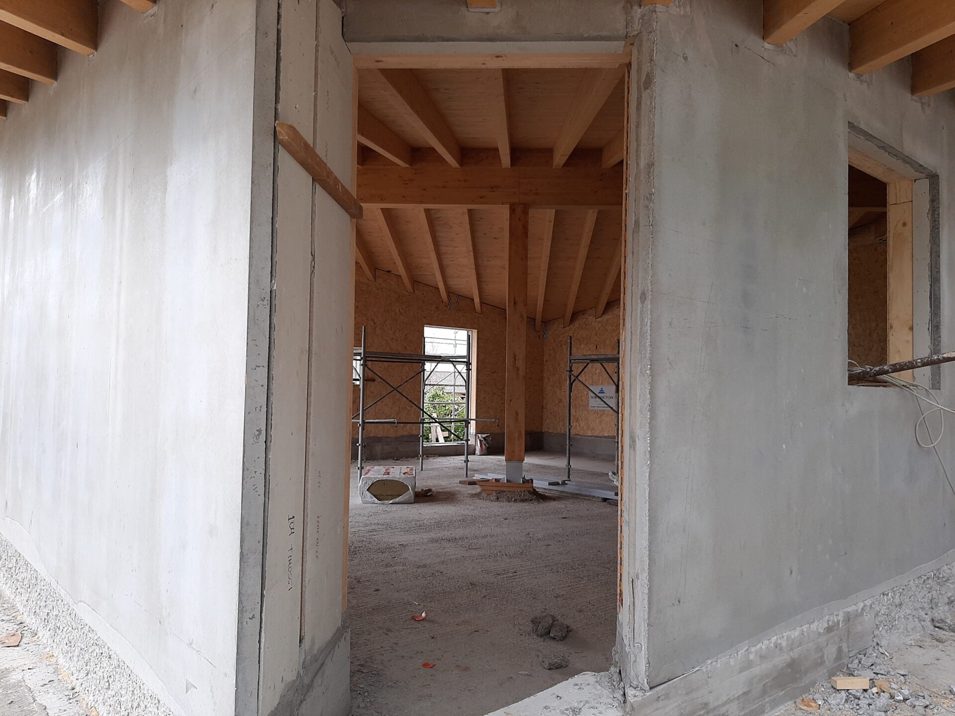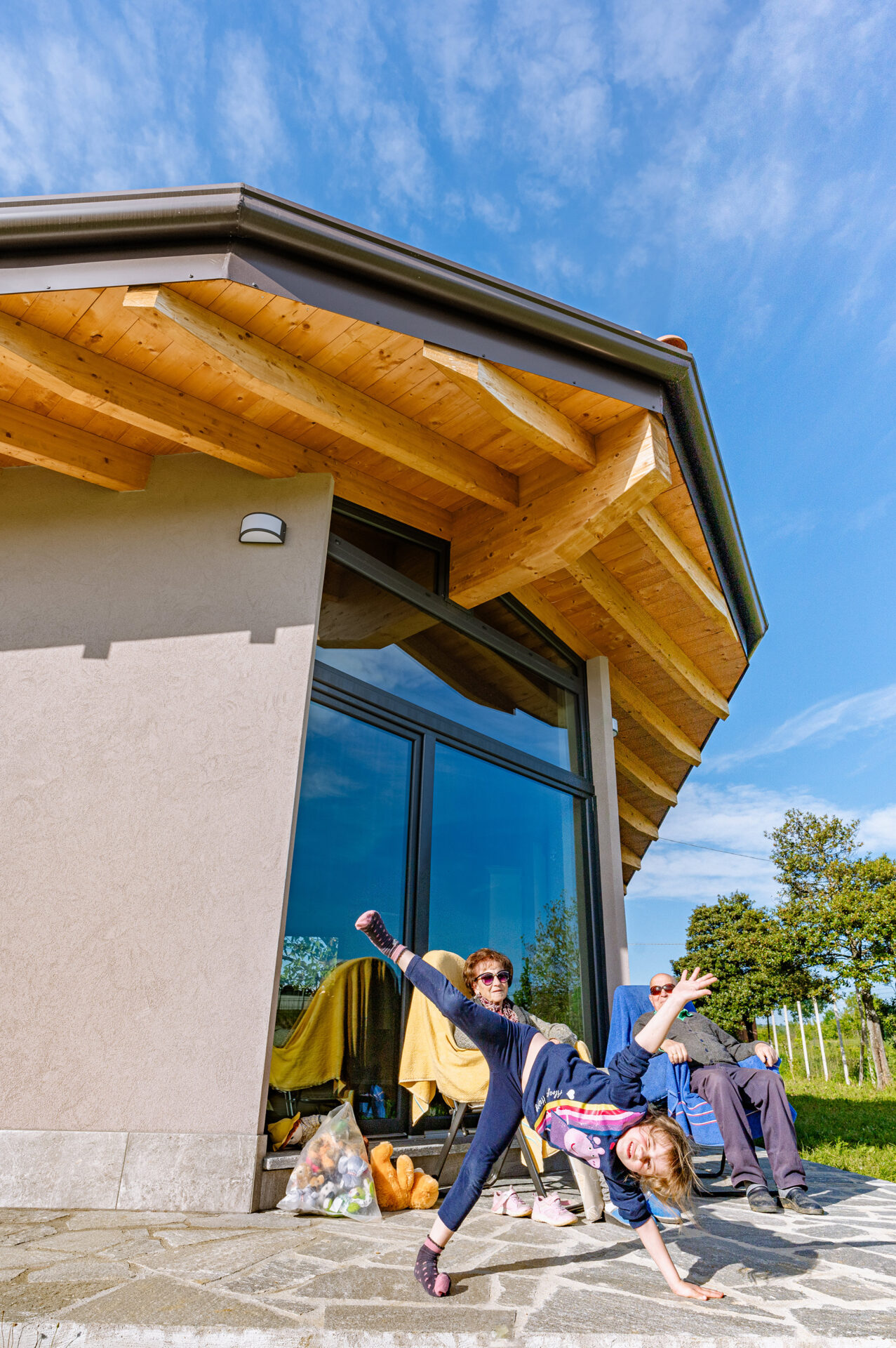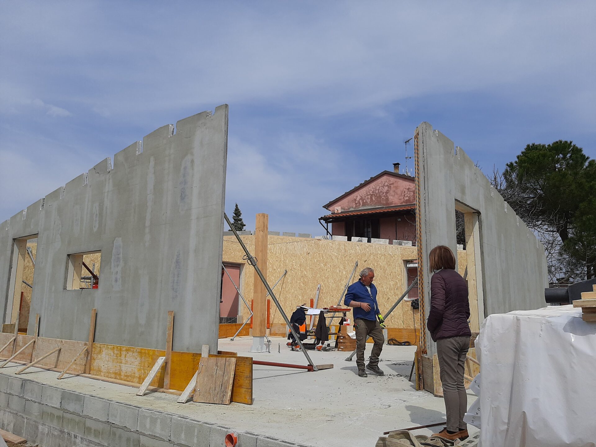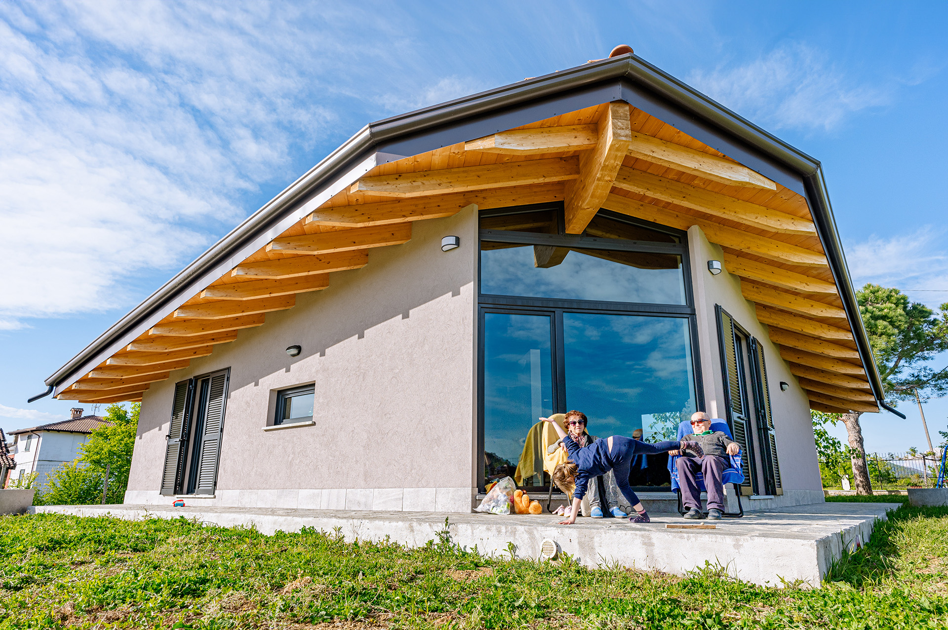 Si è intanto optato per una “traslazione”, in modo da poter mantenere la casa esistente sino a quando la nuova non fosse terminata, e di utilizzare una tecnologia prefabbricata in legno, per accelerare i tempi. Infatti in meno di un anno la famiglia poteva trasferirsi…ed a soli cinque metri da dove aveva vissuto sino ad allora.