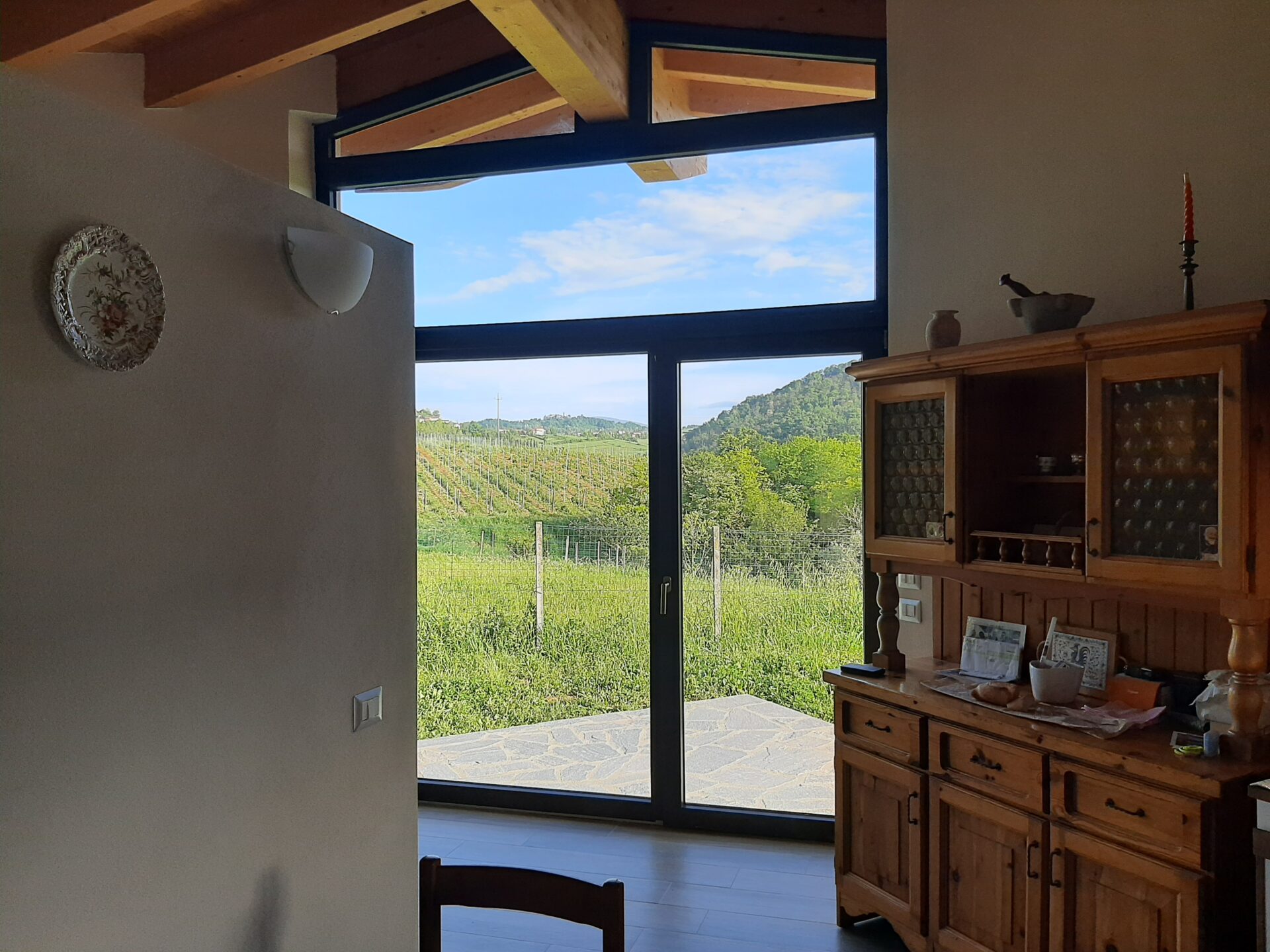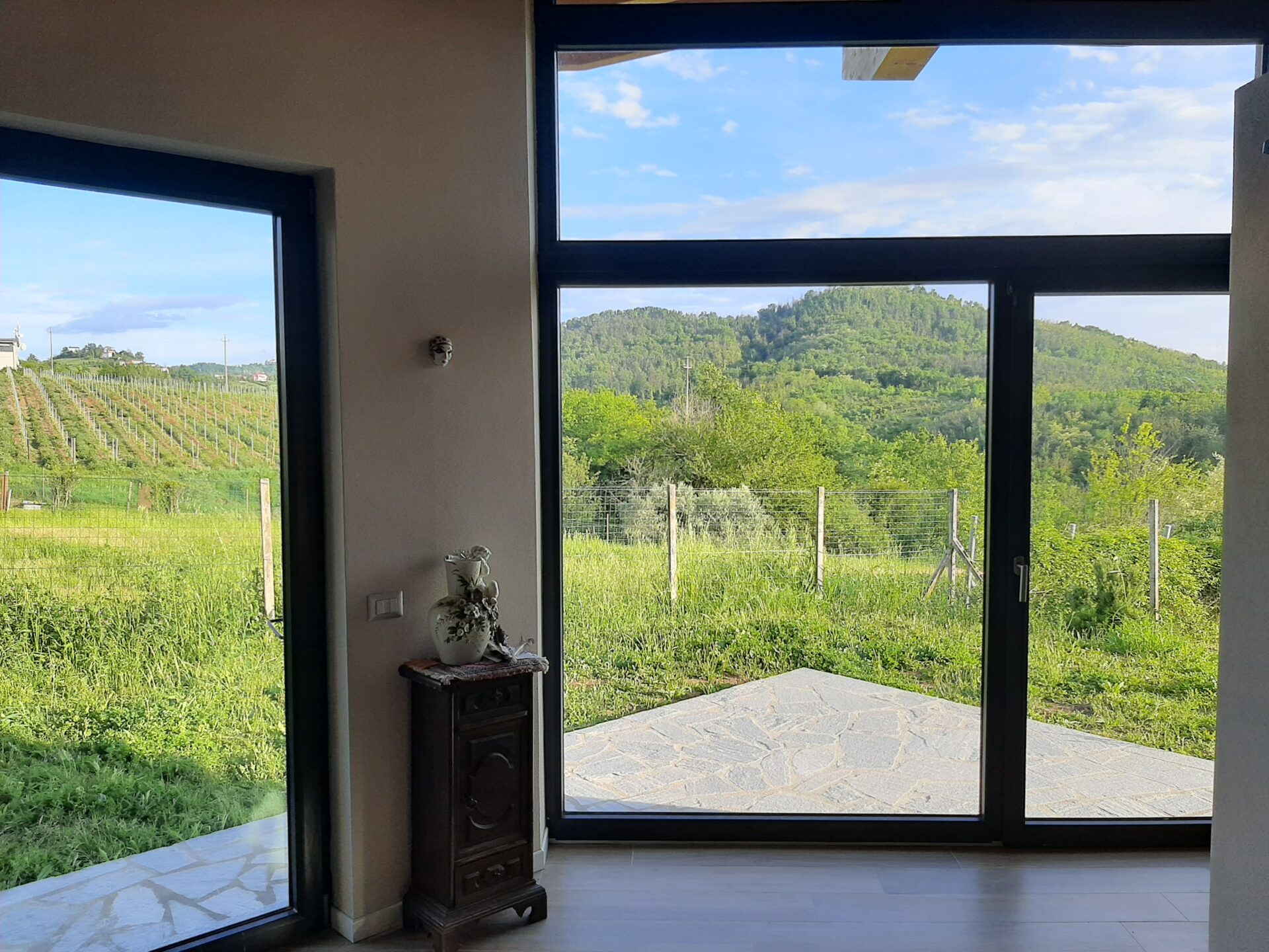 Quì la sensorialità è data da molteplici fattori, in primis il rapporto tra corpo umano e spazio ( che si comprime, dilata, indirizza…), quindi nei materiali naturali e ( last but not least ) la luce naturale e la relazione col bel paesaggio collinare.
