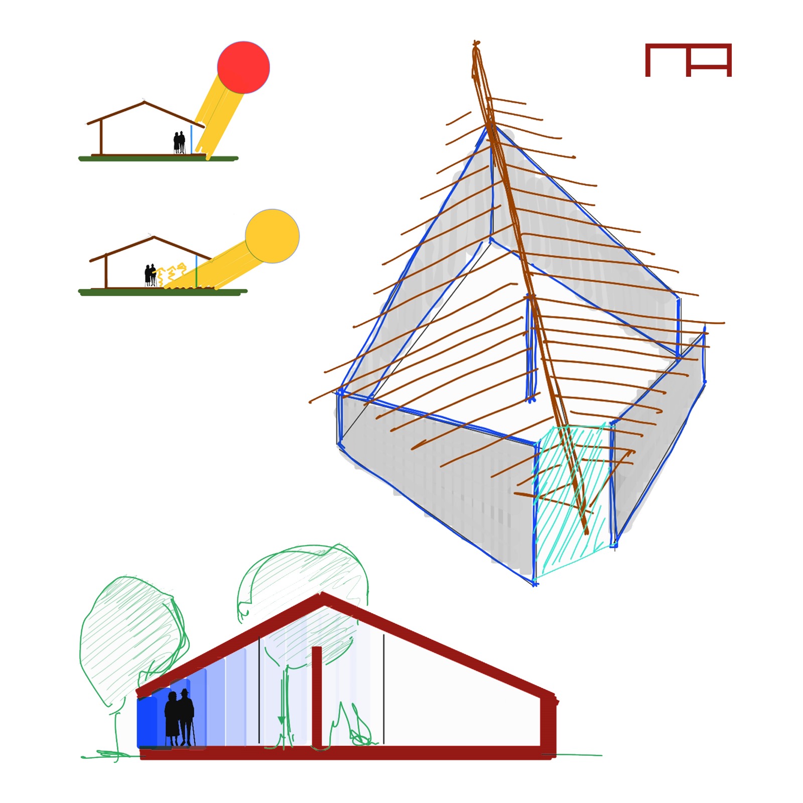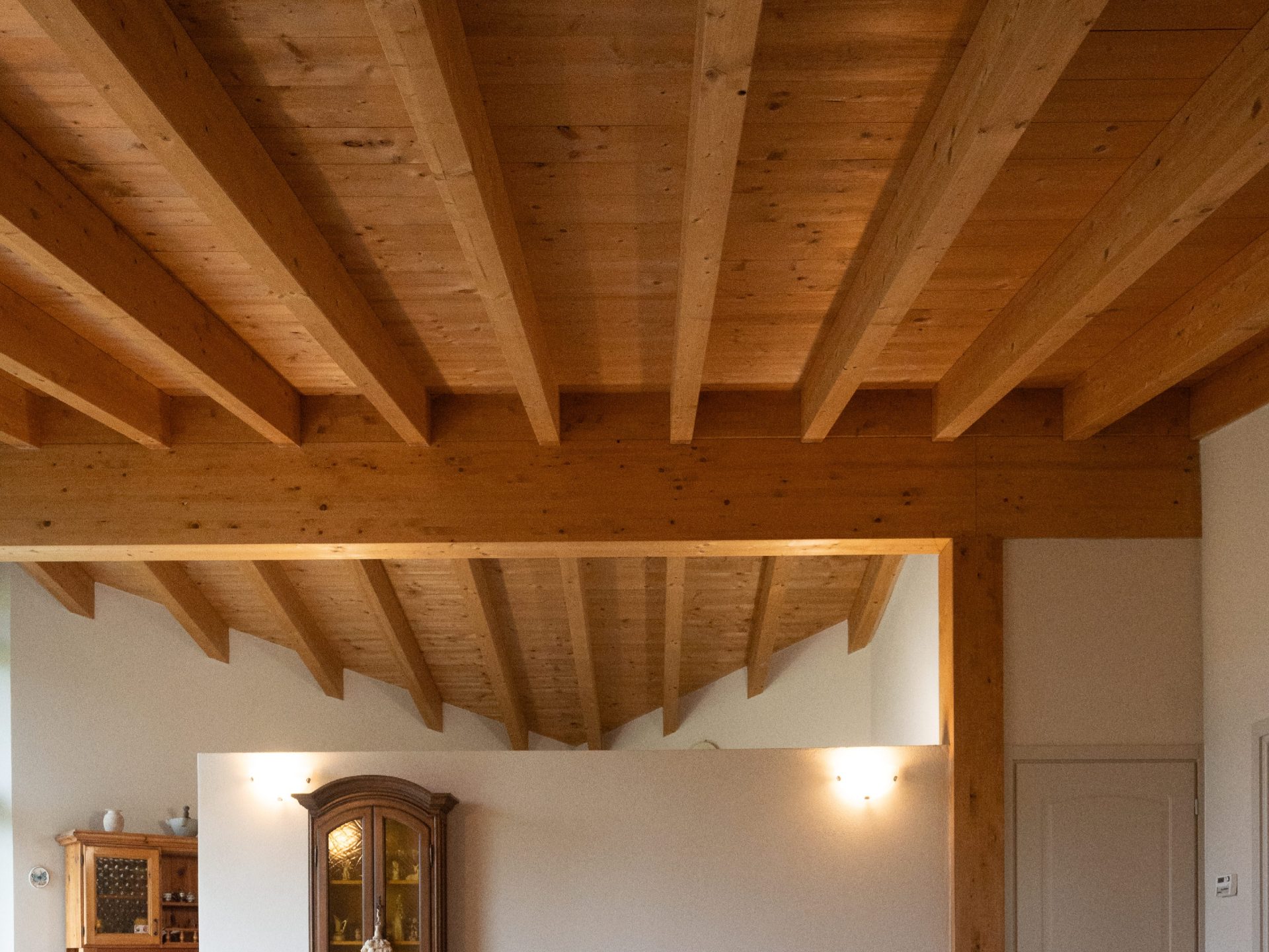 Il concept è tanto semplice quanto sorprendente: su una pianta quadrata il tetto viene realizzato con una “rotazione orizzontale” di 45 gradi: il colmo non è parallelo ai lati, le falde, a vista all’interno, creano pareti ad altezza variabile e pertanto dinamiche. Alcuni angoli vengono svuotati e quindi si entra dove l’altezza è minima, quasi schiacciati sotto una ”punta”, lo spazio subito si dilata e si viene rapiti dalla vetrata che incornicia il paesaggio collinare. A quel punto ci si accorge che la trave di colmo buca la vetrata e si proietta verso l’infinito, senza apparenti sostegni! Ecco perché l’abbiamo chiamata: “la casa dal tetto che vola”: si ha l’impressione di una copertura che, sia dall’interno che dall’esterno, è pronta al decollo!